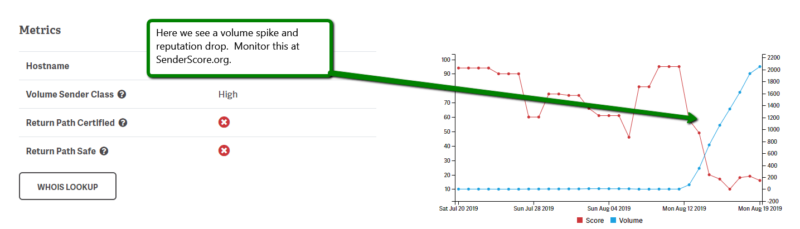 Checking your Sender Score can provide insights into email delivery. Watch out for email volume spikes or a volume higher than what you would expect.